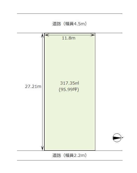 | 取引態様 | 媒介 | 接道 | 西側:幅員4.5mの公道に11.8m接する。 東側:幅員2.2mの公道に11.8m接する。 |